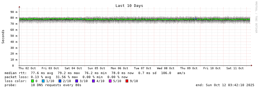 9 > l.root-servers.net (199.7.83.42) [AS7575/AS14259/AS16637/AS18451/AS19905/AS20144/AS27678/AS28513/AS38082/AS38456/AS38880/AS133296/AS262249] 79.308ms 79.223ms 79.241ms
