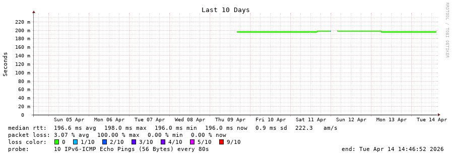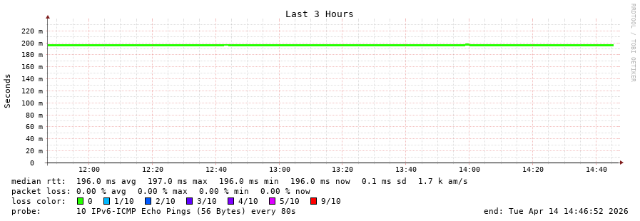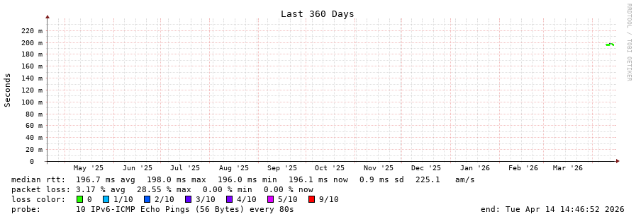 traceroute to 2402:1f00:8400::2:0:19c (2402:1f00:8400::2:0:19c), 30 hops max, 80 byte packets - Generated at 2026-04-14 14:30:01